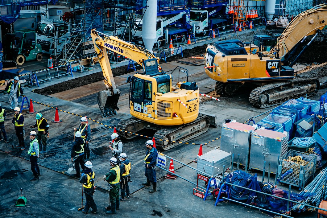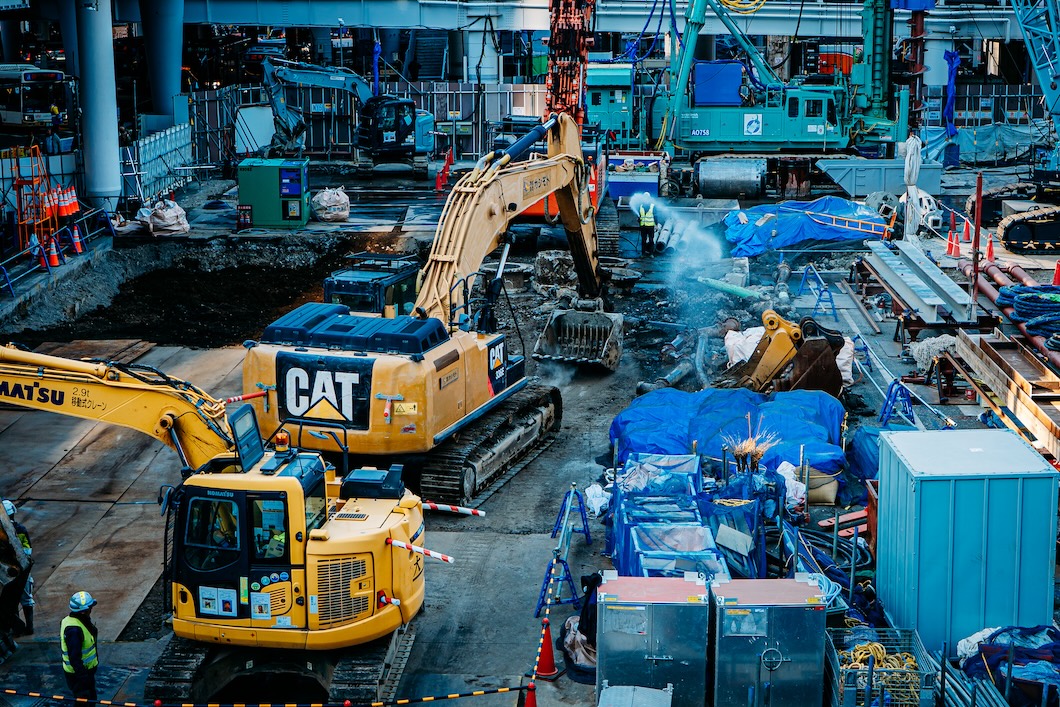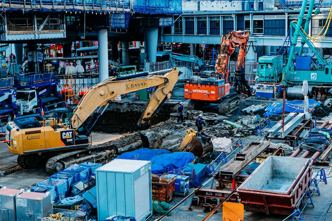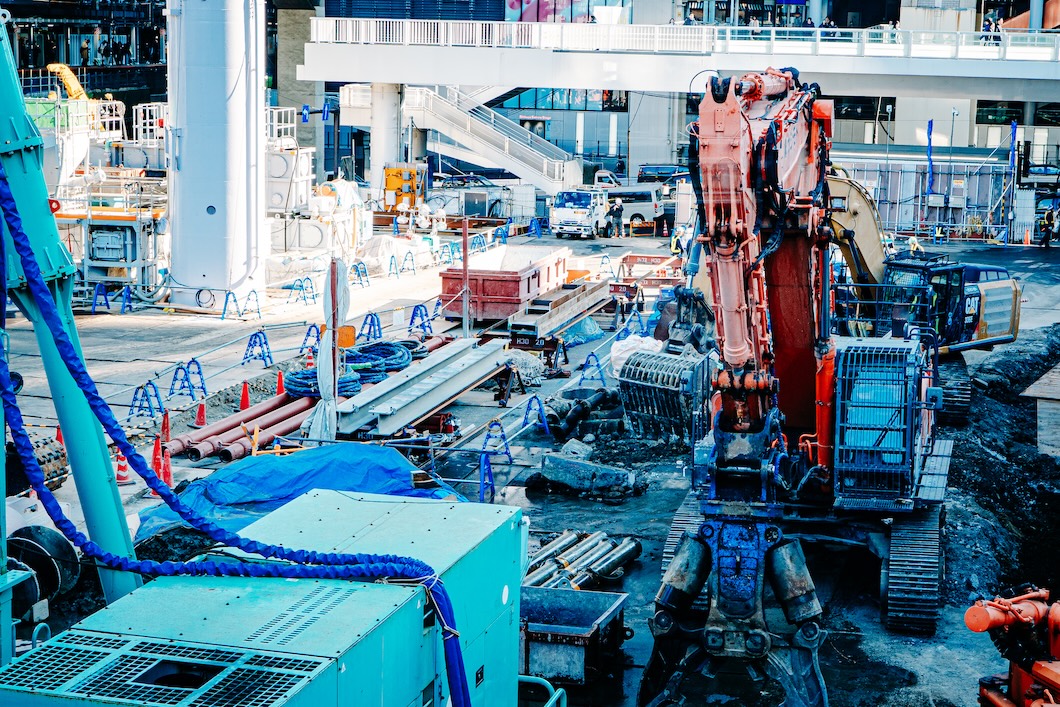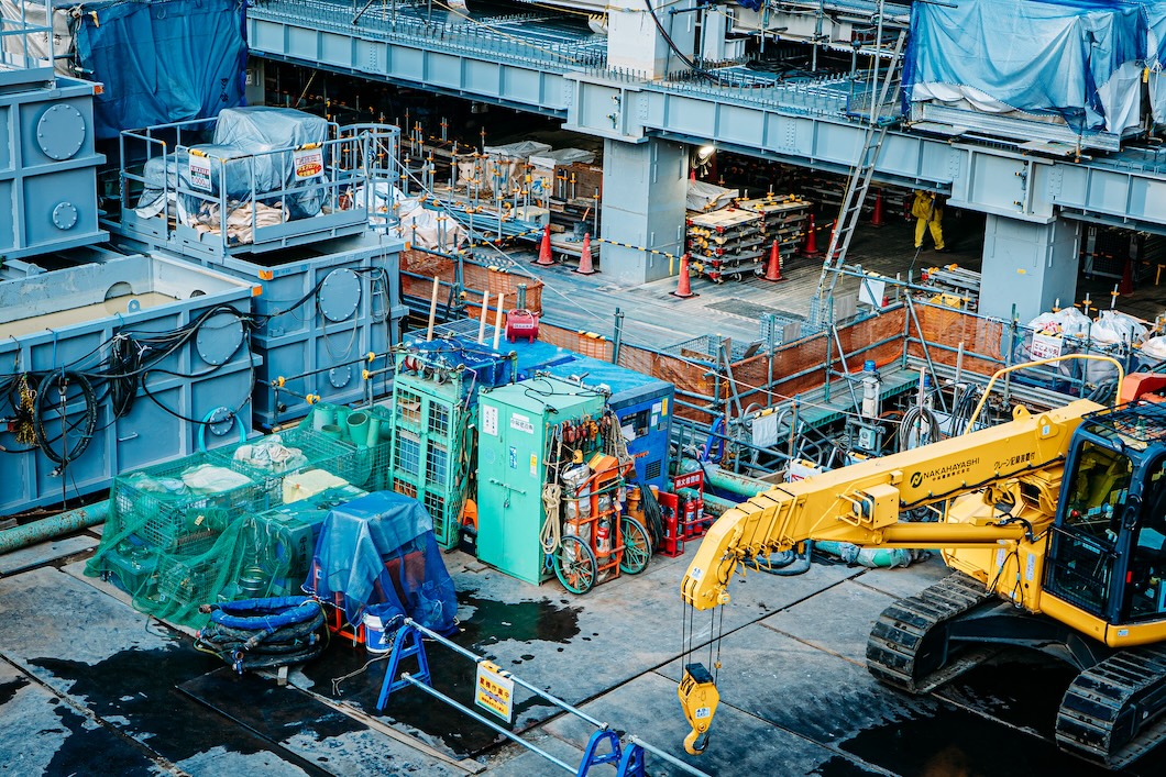 重機や機材が所狭しとぎっしり。